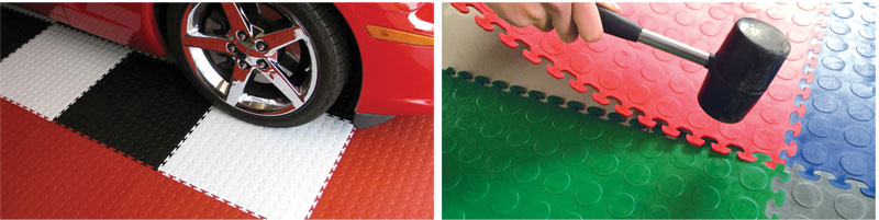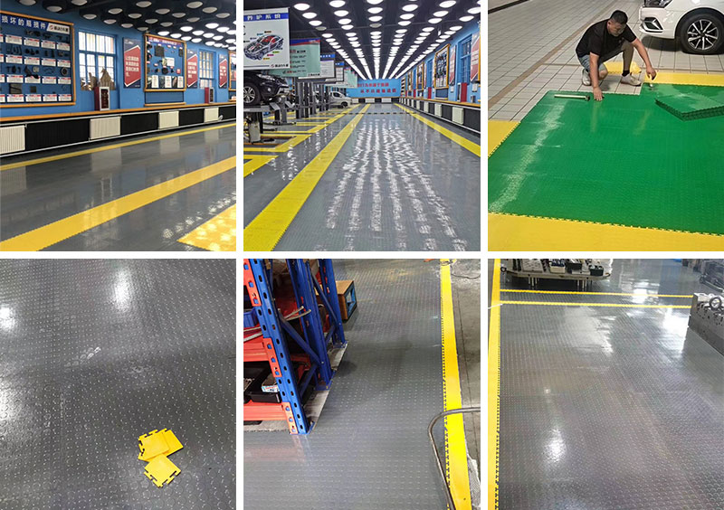 Pvc floor mats use soft polymer plastic materials (polyvinyl chloride), which feature waterproof, oil resistance, non-slip, sound insulation, heat insulation, high load, etc. It can be installed on any of the existing ground foundations including wood, concrete, epoxy coating, ceramic tiles, terrazzo and marble, etc. They are widely used in workshop, warehouse, garage ground , gymnasium, hall and other places.