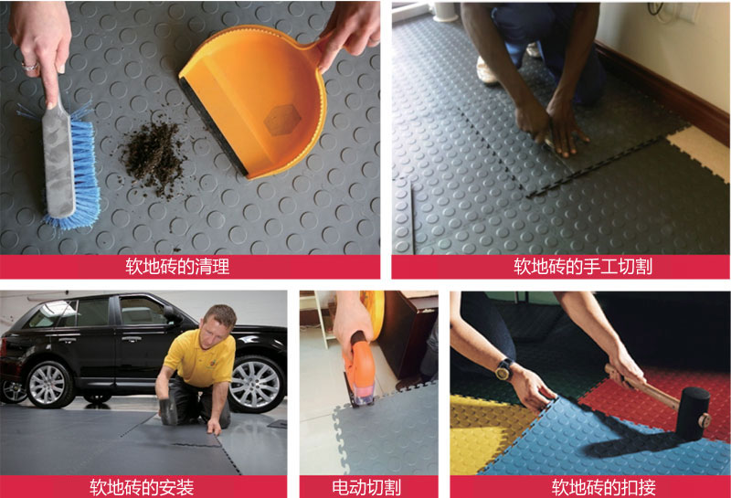 Soft floor tiles with 100% pure new PVC environmental protection raw material production, can be quickly installed on any existing substrate, especially the ground to excessive wear, paint delamination, dust, moisture and contamination, etc., can not affect the rapid escalation of the implementation of the ground under the condition of the normal production workshop.